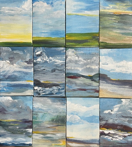 Let’s play! One of the great things about acrylic paint is its quick drying time. We will make use of that characteristic as we build 12 (yes 12!) miniature landscapes, connected by colour, loose style and a few little compositional tricks.