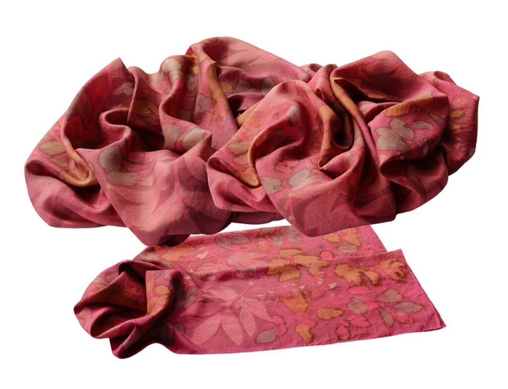 My process utilizes the ancient knowledge of dyeing silk fabrics with pigments that plants naturally produce, and the more contemporary method of botanical printing.