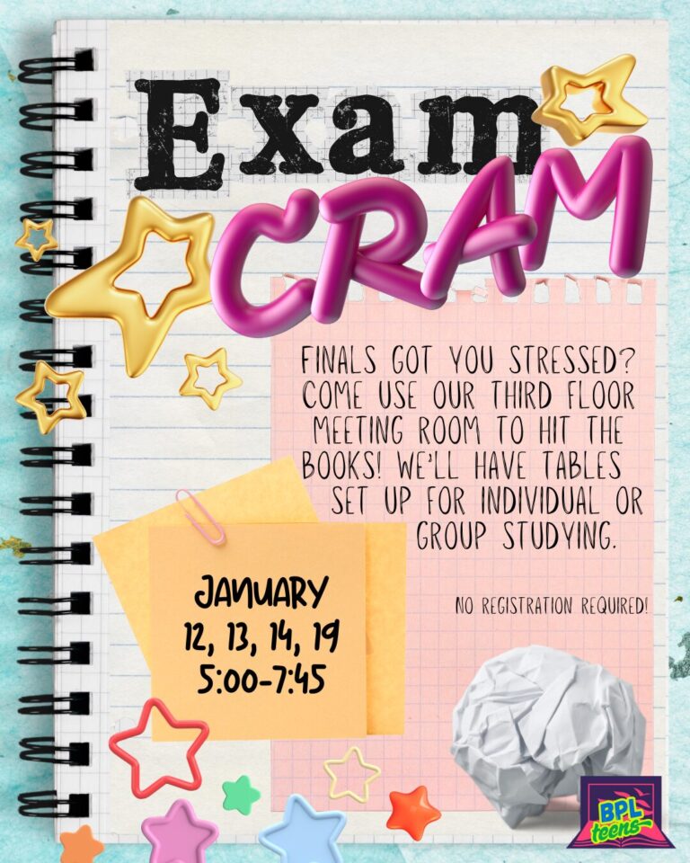 Finals got you stressed? We’re turning the third floor meeting room into a chill, quiet study zone just for teens! Come hit the books—we’ll have snacks to keep you fueled and supplies to keep you organized!
