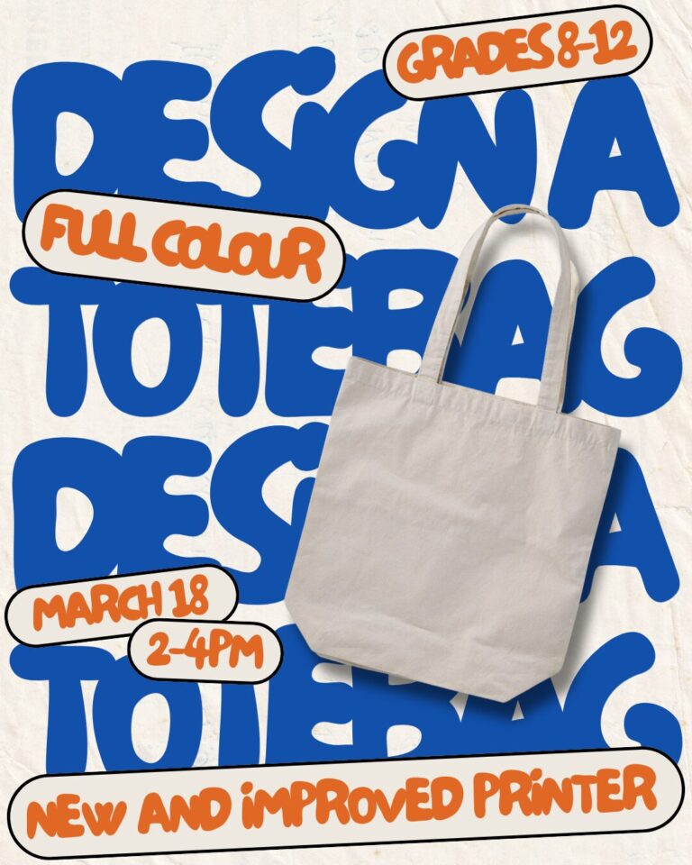 Design a graphic that will be printed in full colour! Put your design on the tote bag provided or bring your own piece of clothing.
